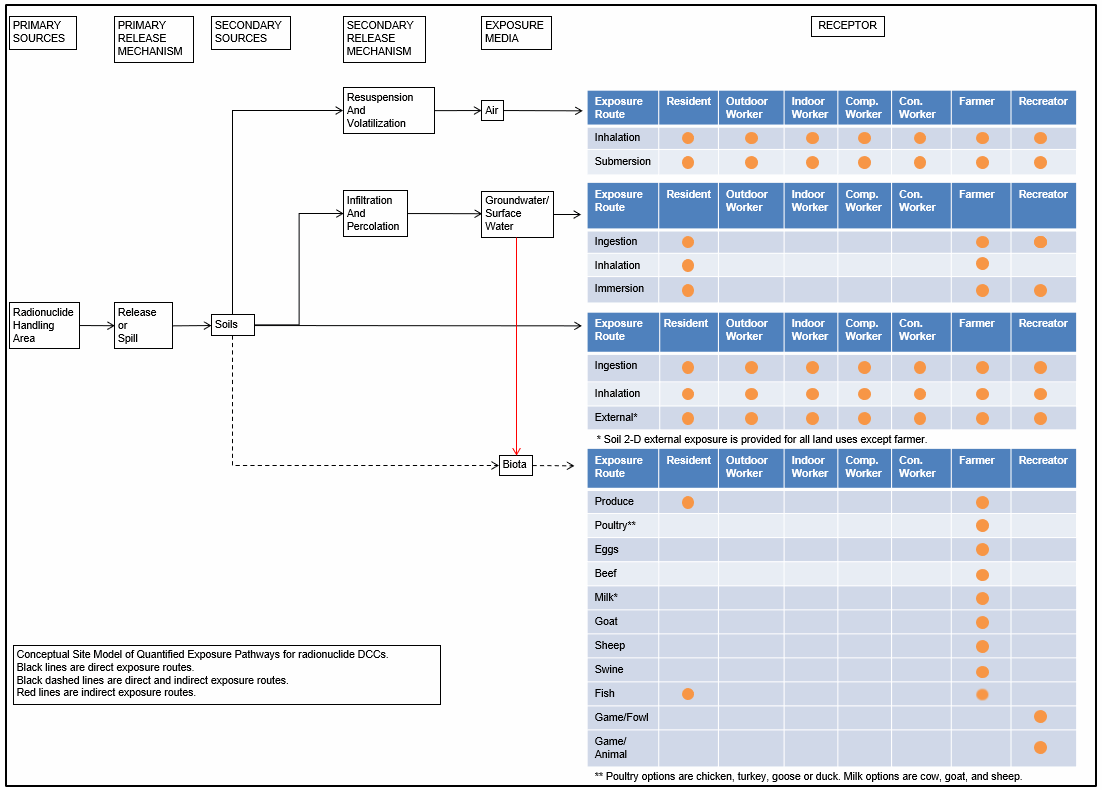 DCCs are radionuclide concentrations that correspond to annual levels of dose from exposure to air, soil, water, and biota. The DCCs, regardless of land use, are based on annual dose and differ from PRGs which are based on 26 years for resident, 25 years for workers (except construction worker), and 40 years for farmer. Dose Coefficients (DCFs) represent the dose equivalent per unit intake (i.e., ingestion or inhalation) or external exposure for a given radionuclide. In dose assessments, these DCFs are used in calculations with radionuclide concentrations and exposure assumptions to estimate dose from exposure to radioactive contamination. The calculations may be rearranged to generate DCCs for a specified level of dose. DCFs may be specified for specific body organs or tissues of interest or as a weighted sum of individual organ dose, termed the effective dose equivalent. These DCFs may be multiplied by the total activity of each radionuclide inhaled or ingested per year or the external exposure concentration to which a receptor may be exposed to estimate the dose to the receptor. Dose Coefficients used are provided by the Center for Radiation Protection Knowledge. The main report is Calculations of Slope Factors and Dose Coefficients, and the tables of DCFs are in a separate appendix.
